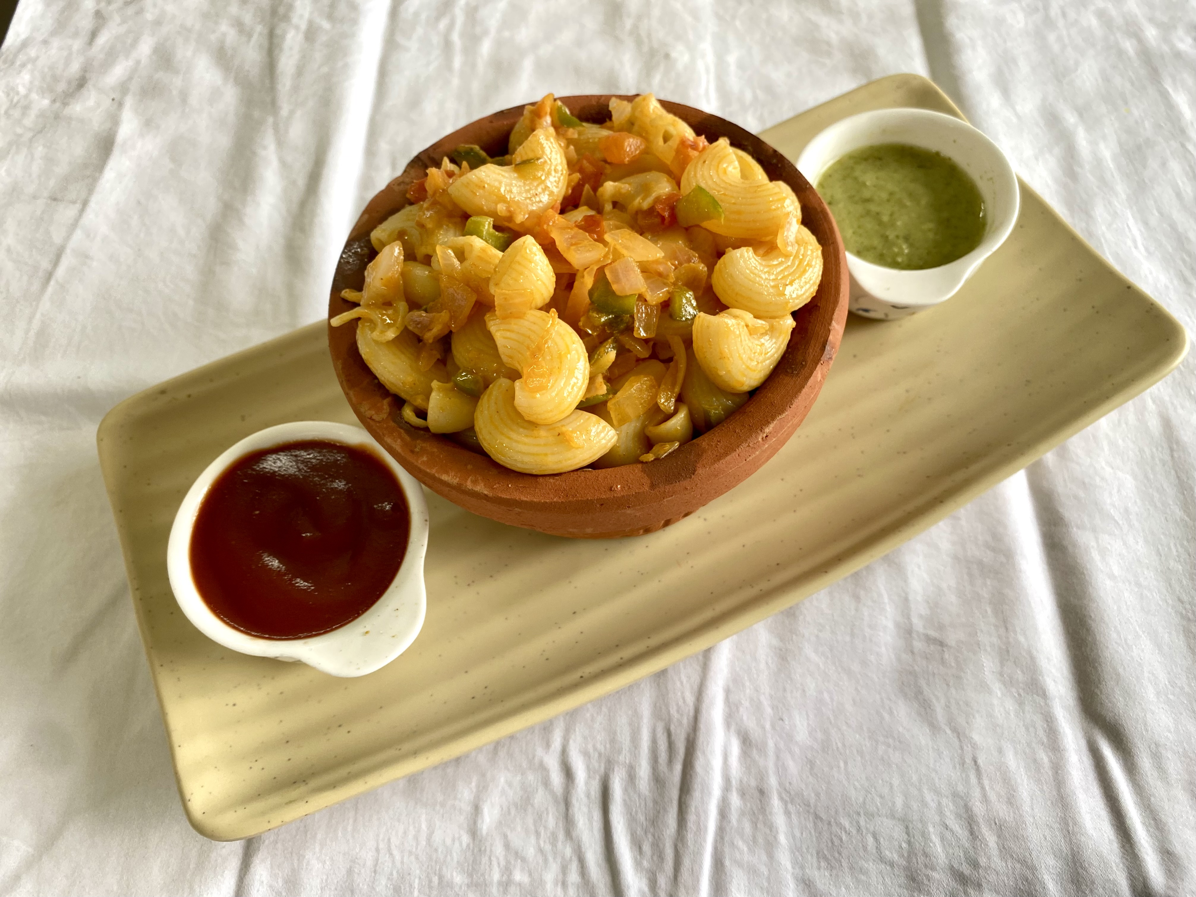 Tossed with onions, tomatoes, bold spices, and desi tadka, turning it into a full-blown masala pasta experience.(made in Desi Ghee)